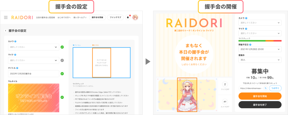バーチャル握手会は、オンラインでファンと安全に1対1で話せるイベントをいつでも開催できます。