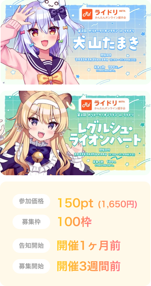 参加ポイントを設定して、好きなタイミングで自由にブラウザで握手会を開催できます。